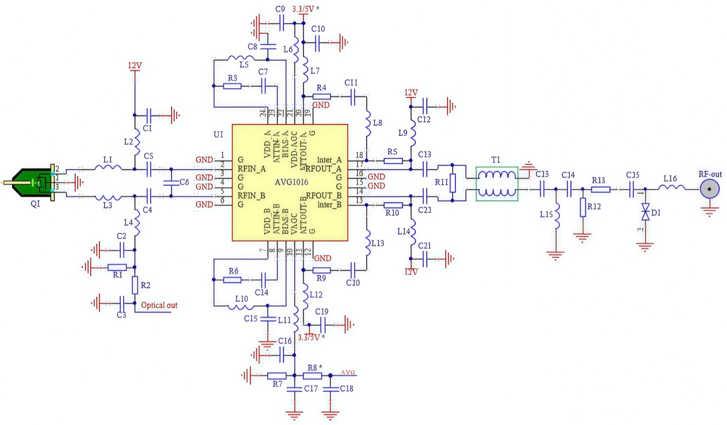O AVG1016 da Sanland é um amplificador de ganho variável com Atenuador controlado por tensão. O amplificador tem alta linearidade e baixo ruído alcançados usando o 0,5um Processo GaAs E-PHEMT. Está alojado em uma miniatura 4,0 x Pacote Quad-Flat-Non-Lead (QFN) de 4,0 mm e 24 pinos. Isso é projetado para uso ideal de 45 MHz a 1000 MHz. O tamanho compacto e o perfil baixo, juntamente com a alta ganho e alta linearidade tornam o AVG1018 uma escolha ideal como amplificador para rede CATV e rede FTTH.